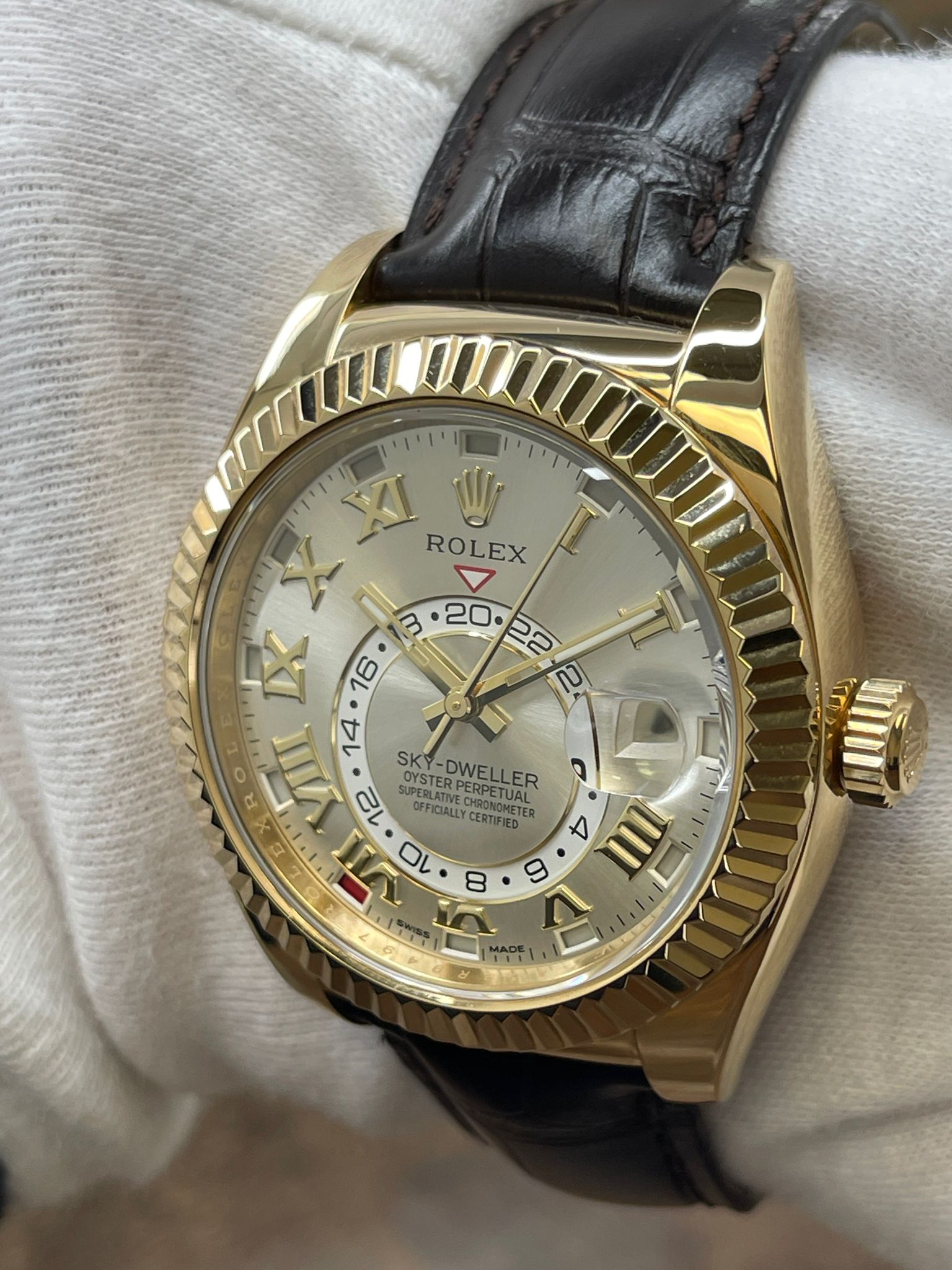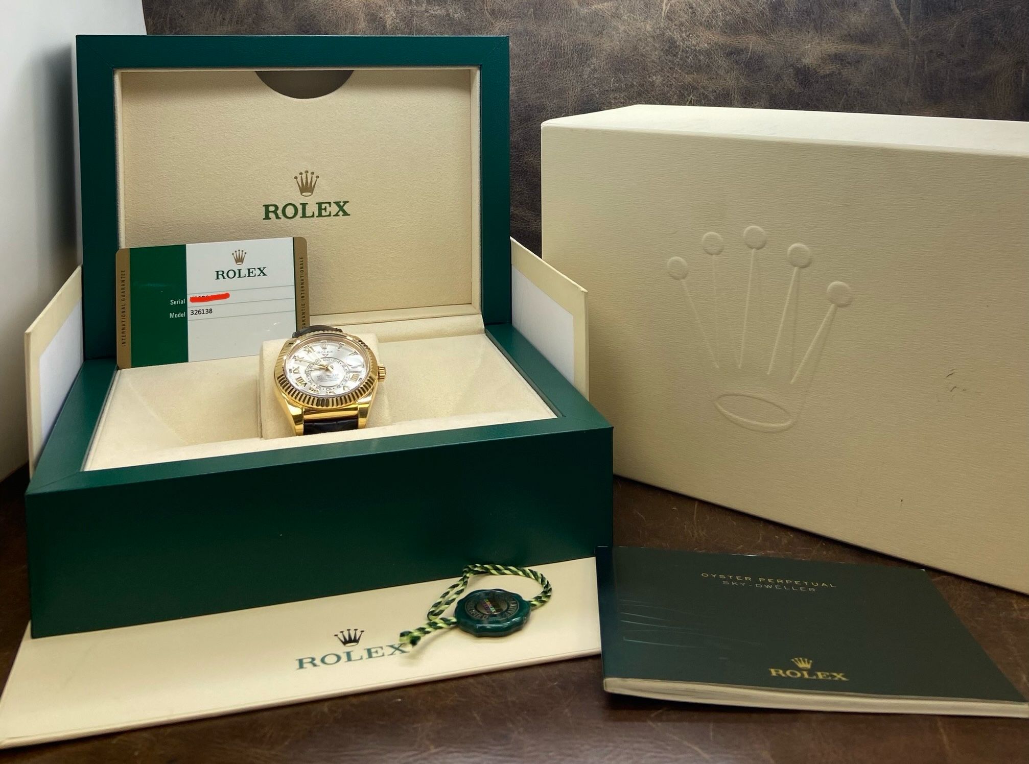 This pre-owned Rolex Sky Dweller 18K Yellow Gold B&P 326138 is in mint condition and comes with: original Rolex double box, warranty card, booklet, tag. Max wrist size: 7.5 in.