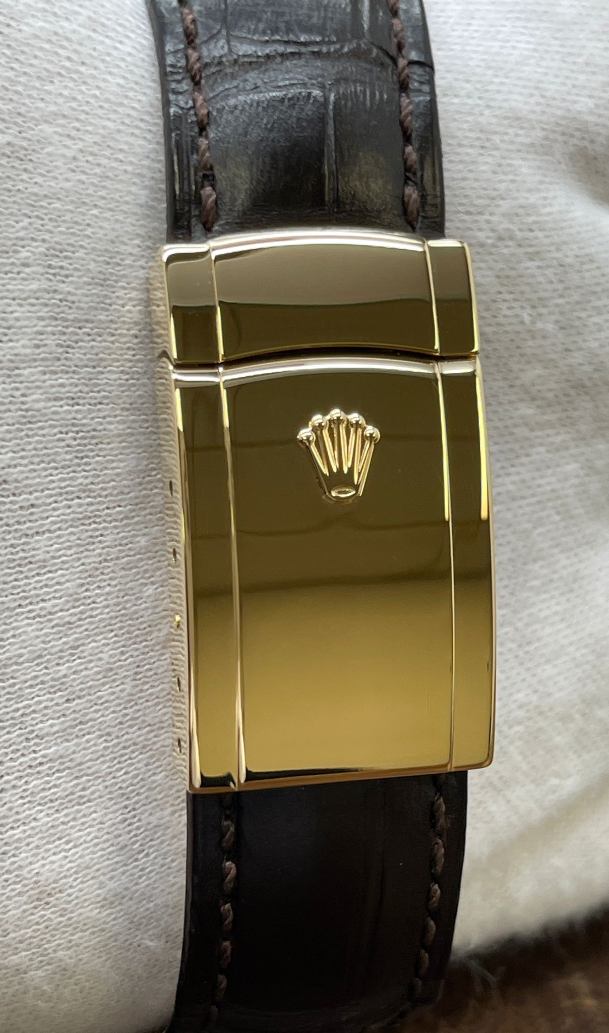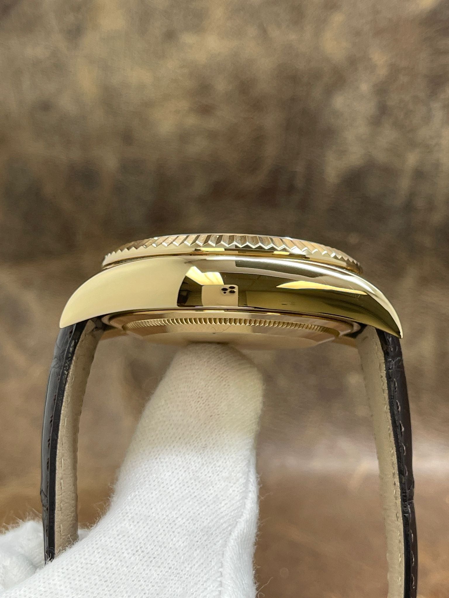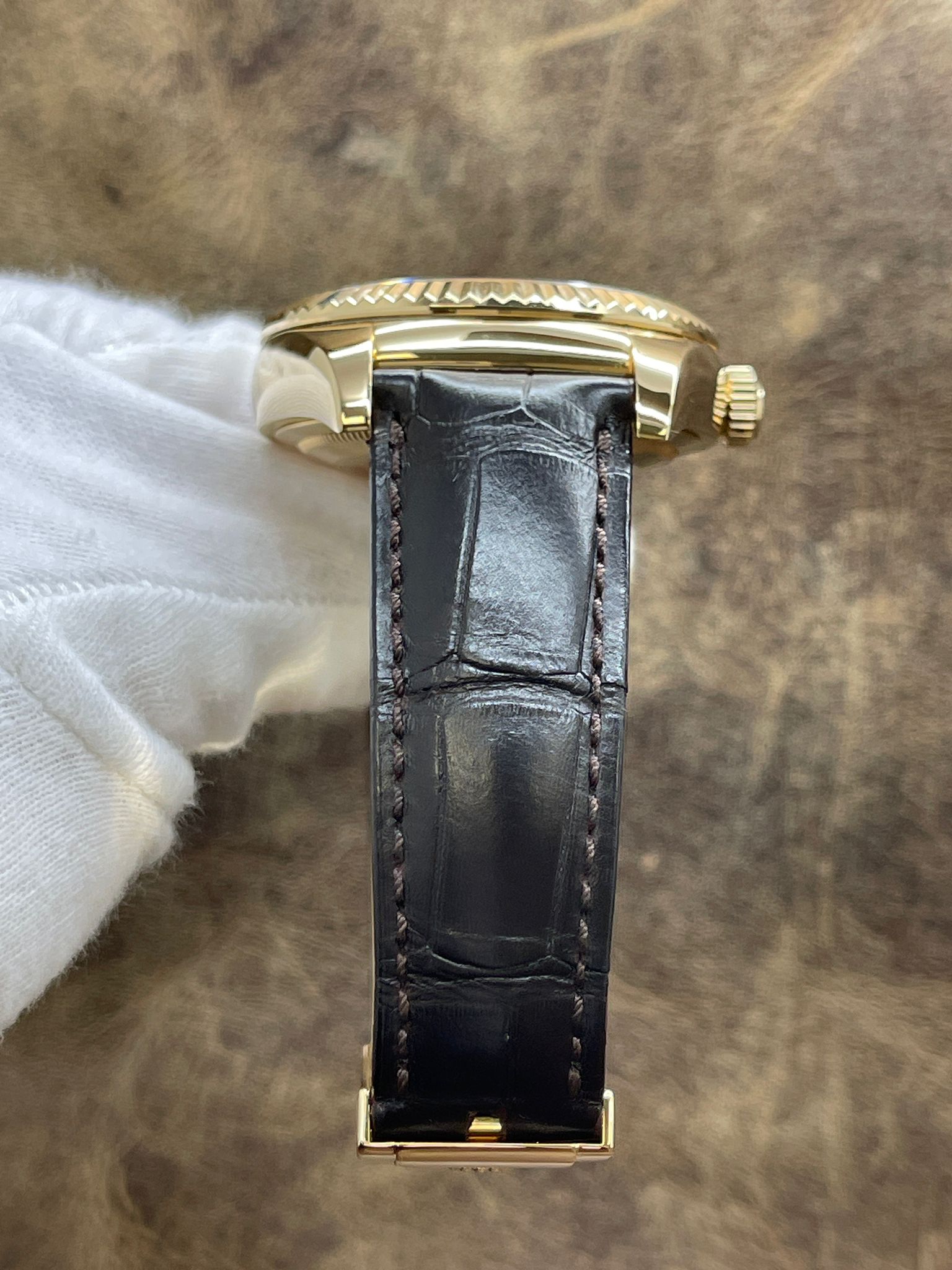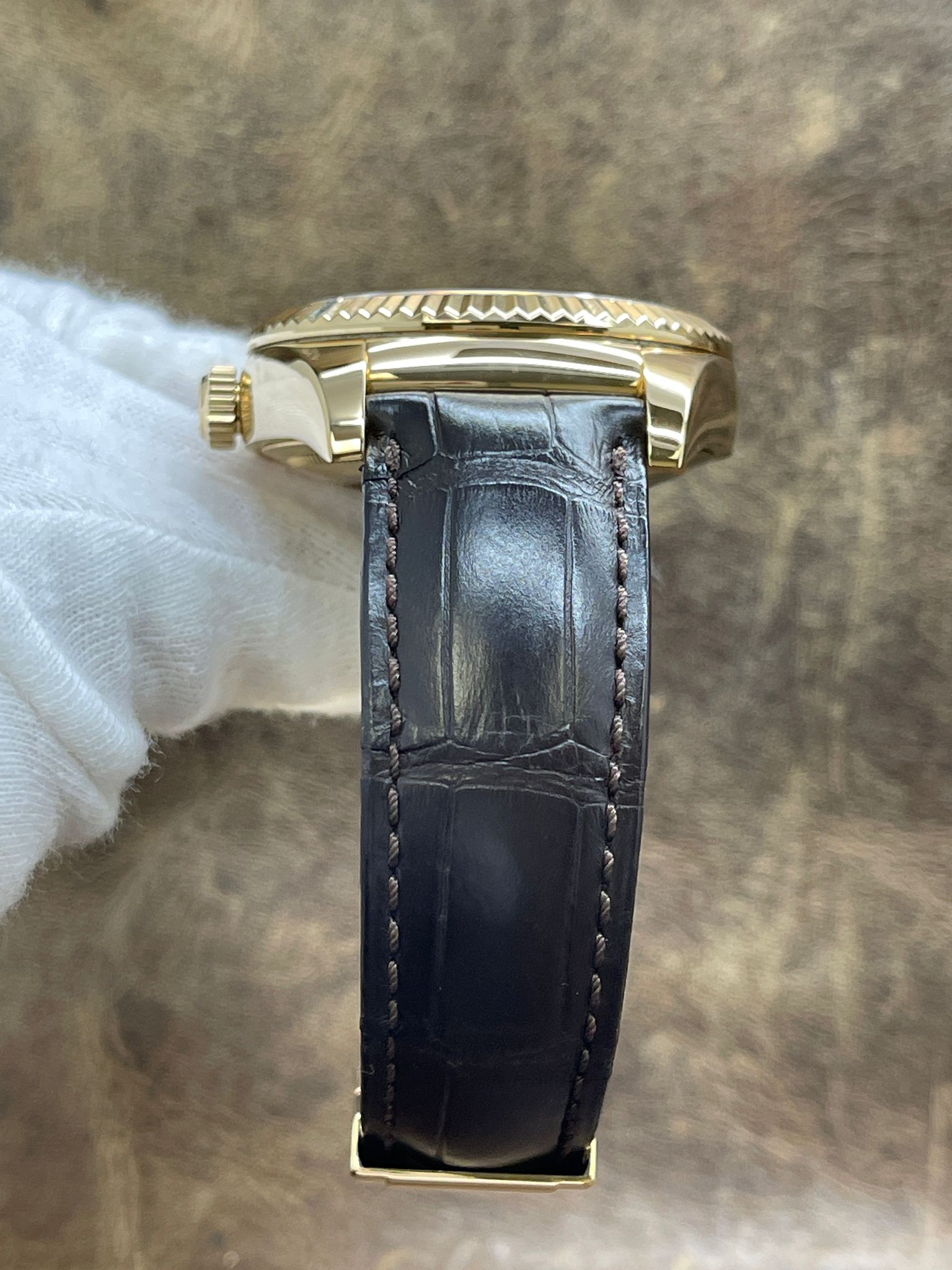 - Features Date; Hour; Minute; Seconds; Chronometer; GMT; 18K Gold; Leather; Analog; strap