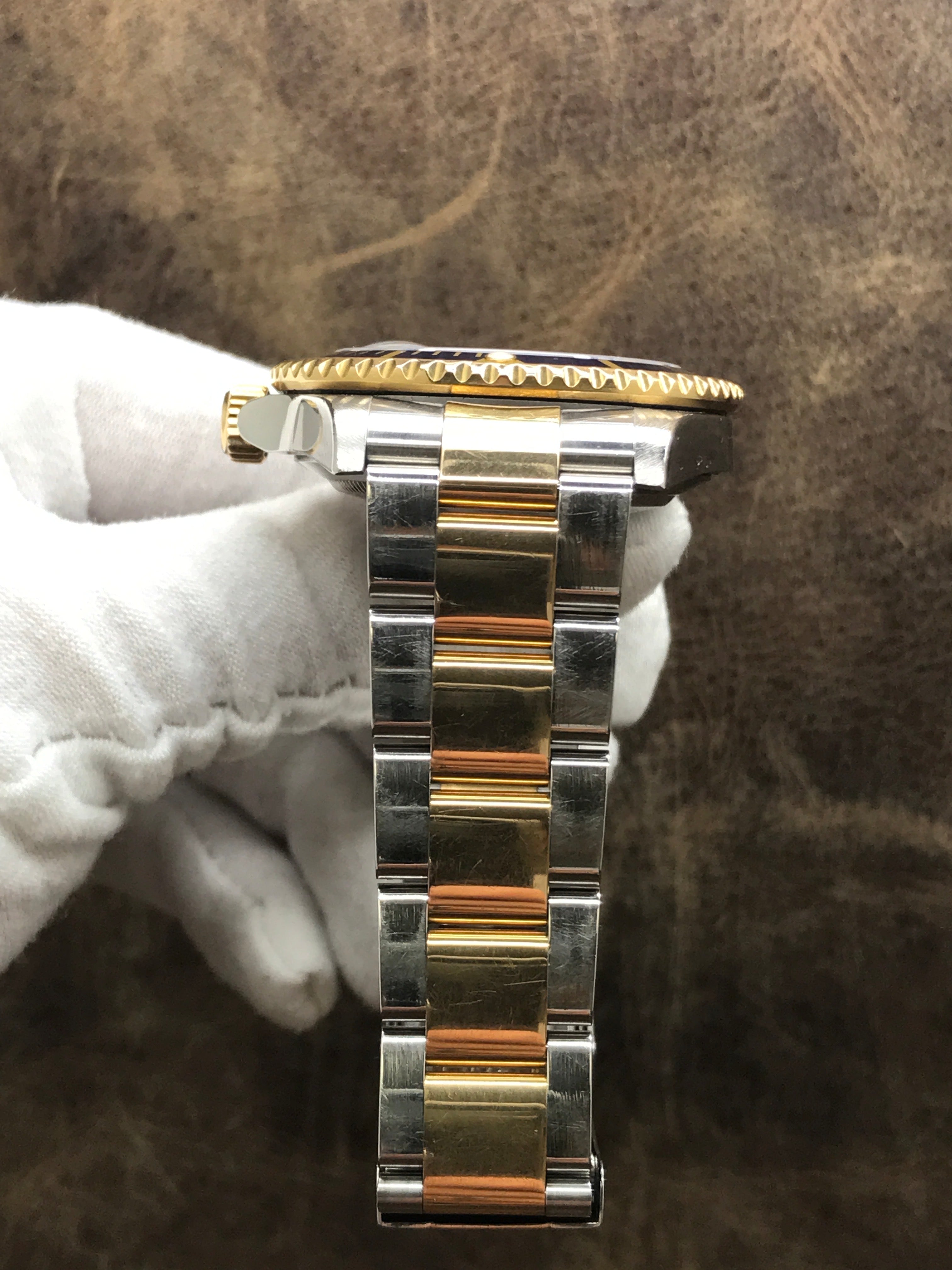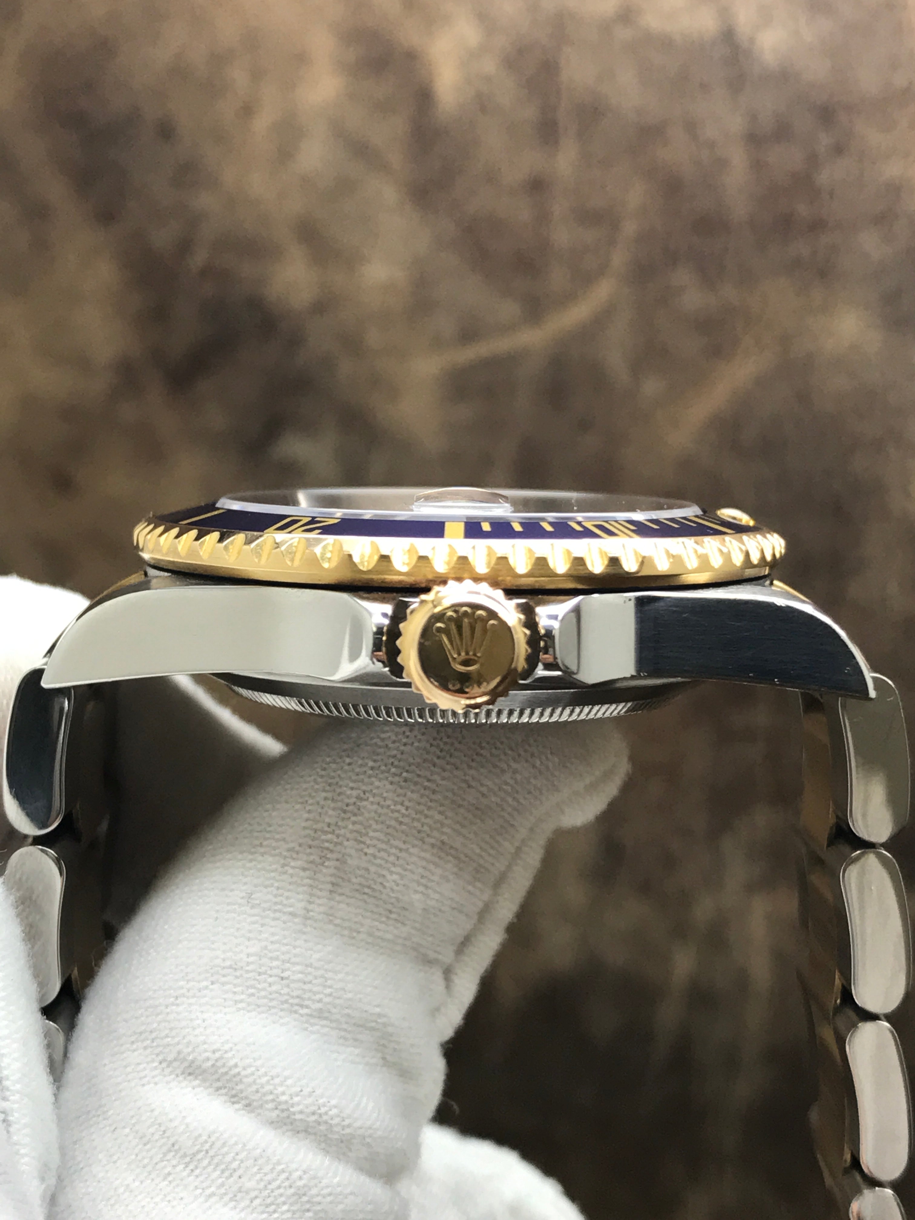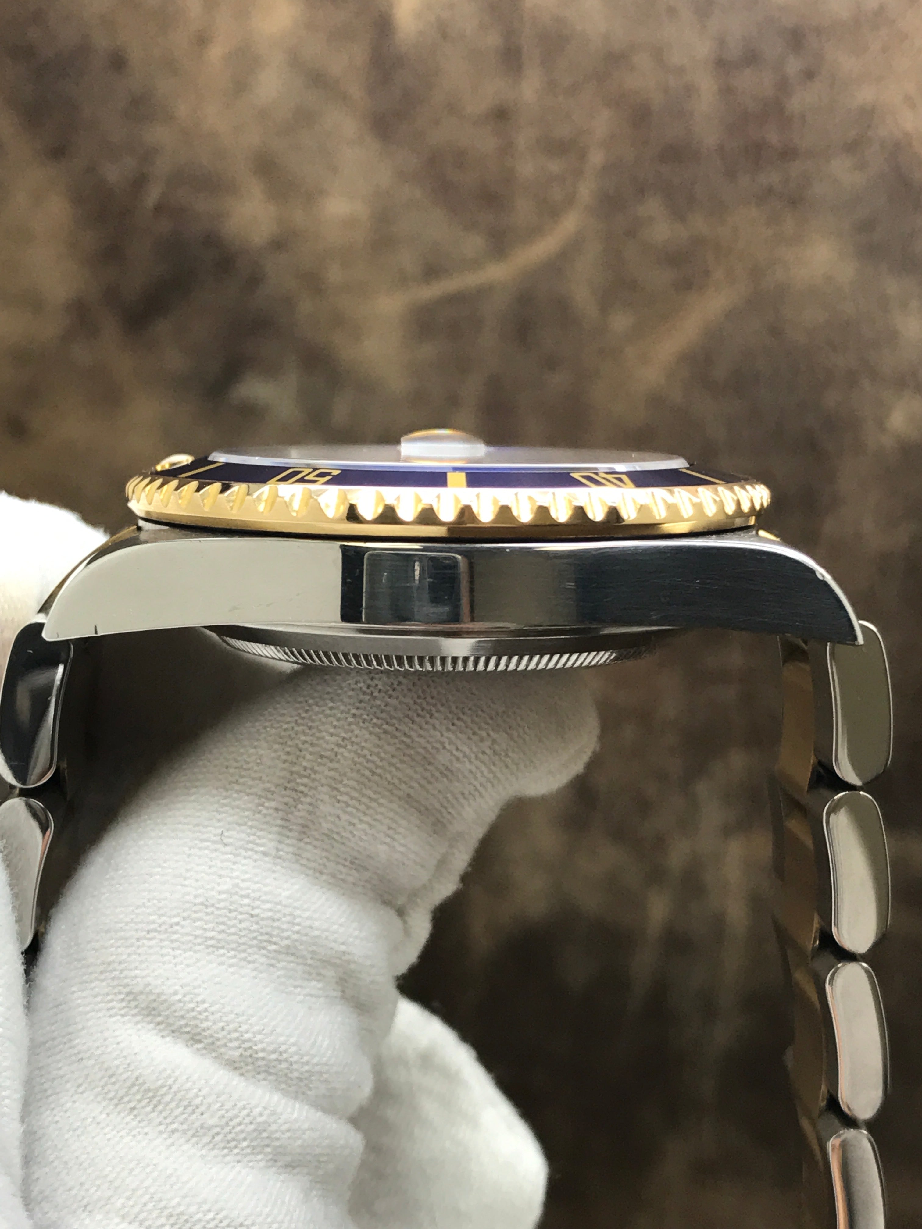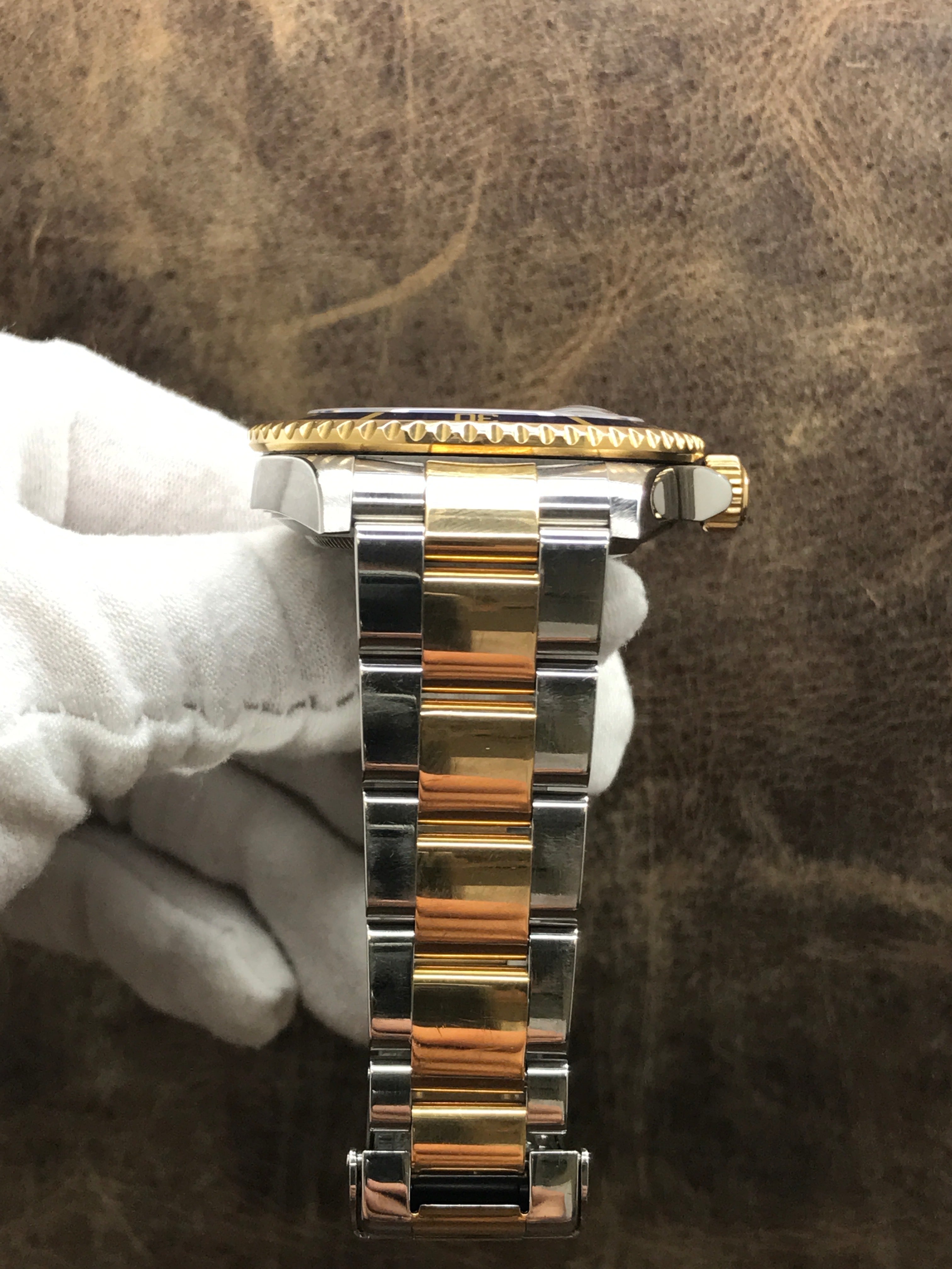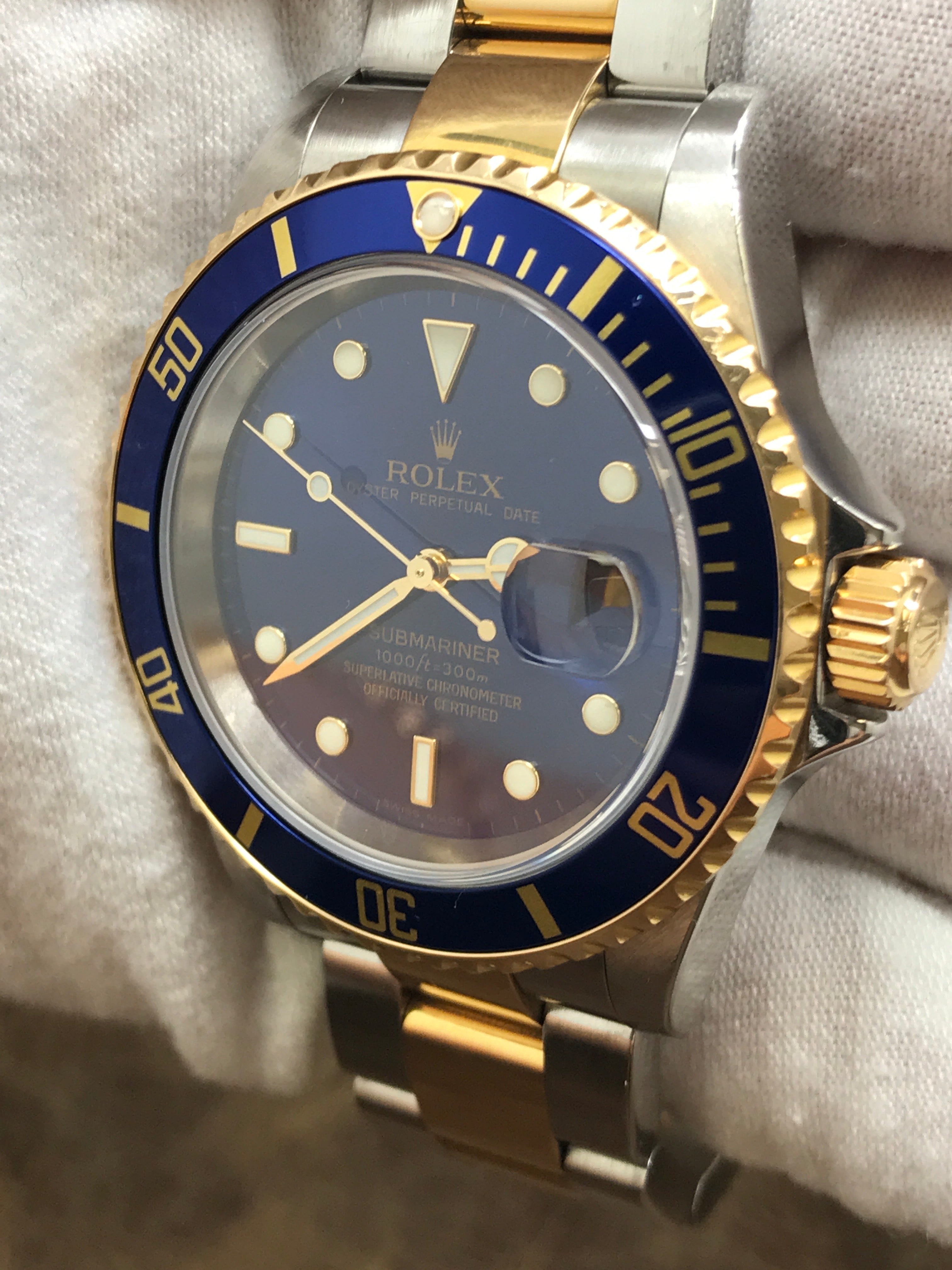 Stainless steel case with a stainless steel & 18k yellow gold oyster bracelet. Uni-directional rotating 18k yellow gold bezel. Blue dial with gold tone & luminous hands and luminous dots hour markers. Dial type: analog. Rolex calibre 3135 automatic movement with about 48 hours of power reserve. Scratch resistant sapphire crystal. Screw down crown. Solid case back. Case size: 40 mm. Case thickness: 12.5 mm. Round case shape. Band width: mm. Oysterlock clasp. Water resistant at 300 meters / 1000 feet. Functions: date, hour, minute, second, chronometer. Rolex Submariner Date 16613 Blue Dial Automatic Men's Watch.