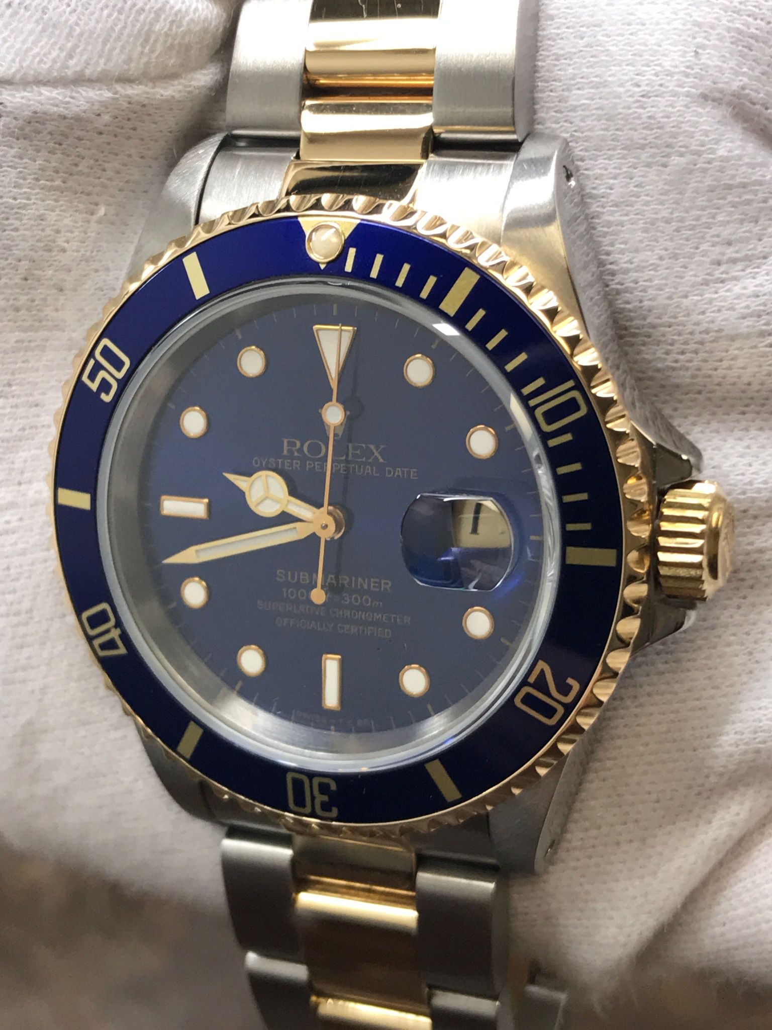 Stainless steel case with a stainless steel & 18k yellow gold oyster bracelet. Uni-directional rotating 18k yellow gold with aluminium blue ring bezel. Blue dial with gold-tone mercedes-logo, sword, and breguet-style shape hands and luminous dot & index hour markers. Dial type: analog. Rolex calibre 3135 automatic movement with about 48 hours of power reserve. Scratch resistant sapphire crystal. Screw down crown. Solid case back. Case size: 40 mm. Case thickness: 12.5 mm. Round case shape. Band width: mm. Oysterlock clasp. Water resistant at 300 meters / 1000 feet. Functions: date, hour, minute, second, chronometer. Rolex Submariner Date with B&P 16613 Blue Dial Automatic Men's Watch.
