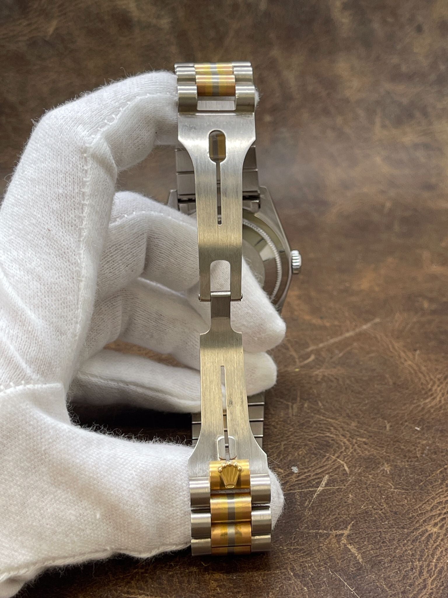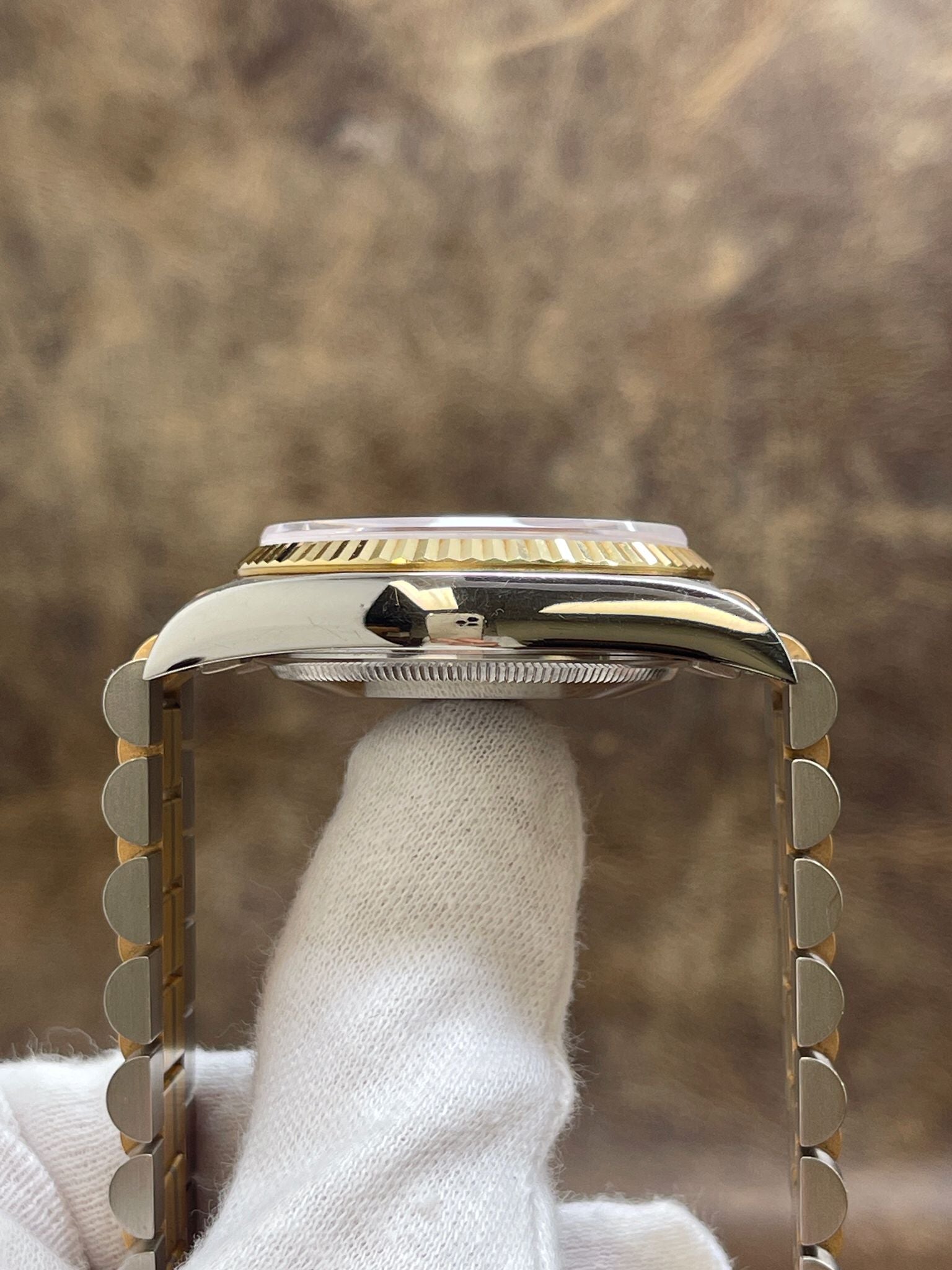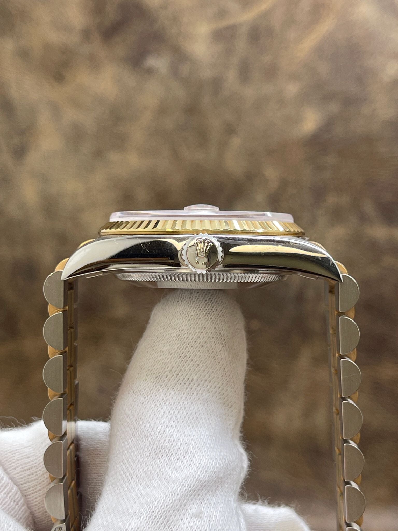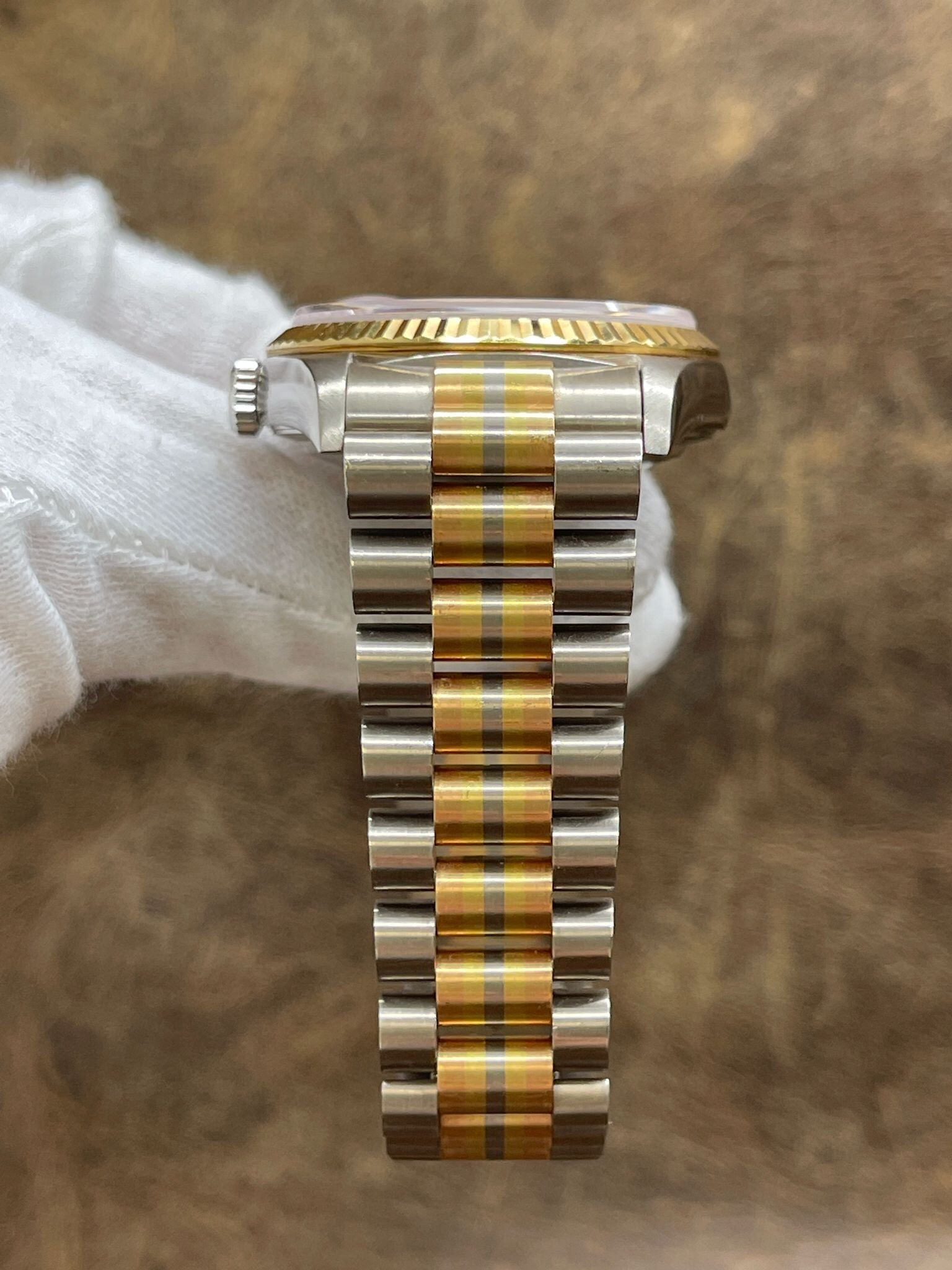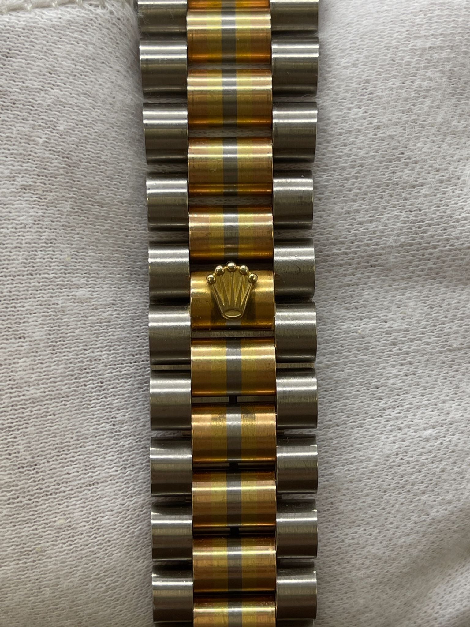 This pre-owned Rolex Tridor President Day Date 36mm 18239B is in mint condition and comes with: NO box or papers. The watch is 100% MINT and unpolished. Max wrist size: 6.75 in.