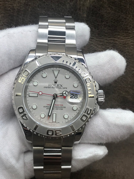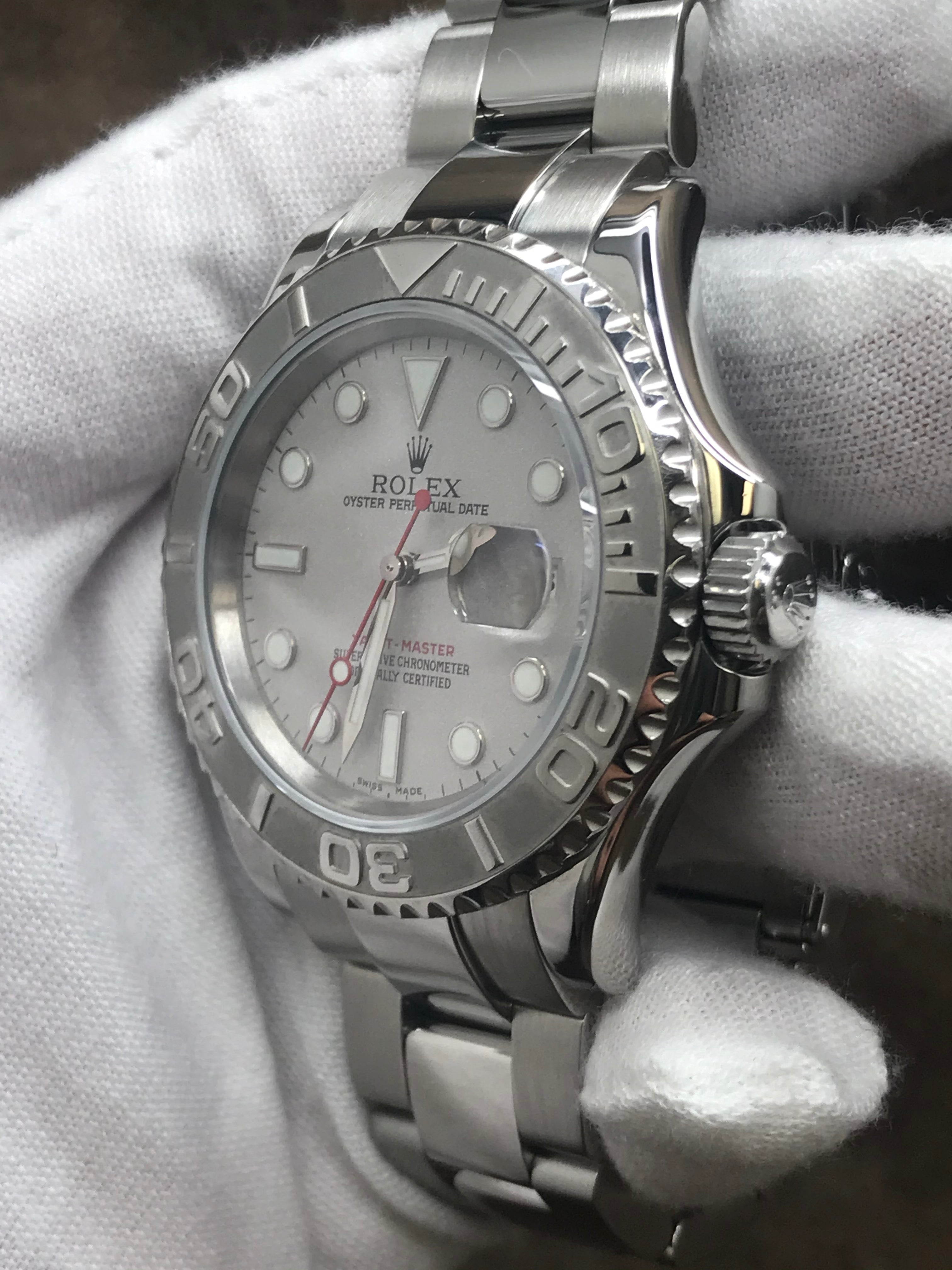 Stainless steel case with a stainless steel bracelet. Uni-directional rotating platinum bezel. Silver dial with luminous silver-tone mercedes-logo, sword shape hands and luminous dots hour markers. Dial type: analog. Luminescent hands and markers. Rolex calibre 3135 automatic movement with about 48 hours of power reserve. Scratch resistant sapphire crystal. Screw down crown. Solid case back. Case size: 40 mm. Case thickness: 12 mm. Round case shape. Band width: 20 mm. Oysterlock clasp. Water resistant at 100 meters / 330 feet. Functions: date, hour, minute, second. Rolex Yacht-Master 40mm 16622 Silver Dial Automatic Men's Watch.