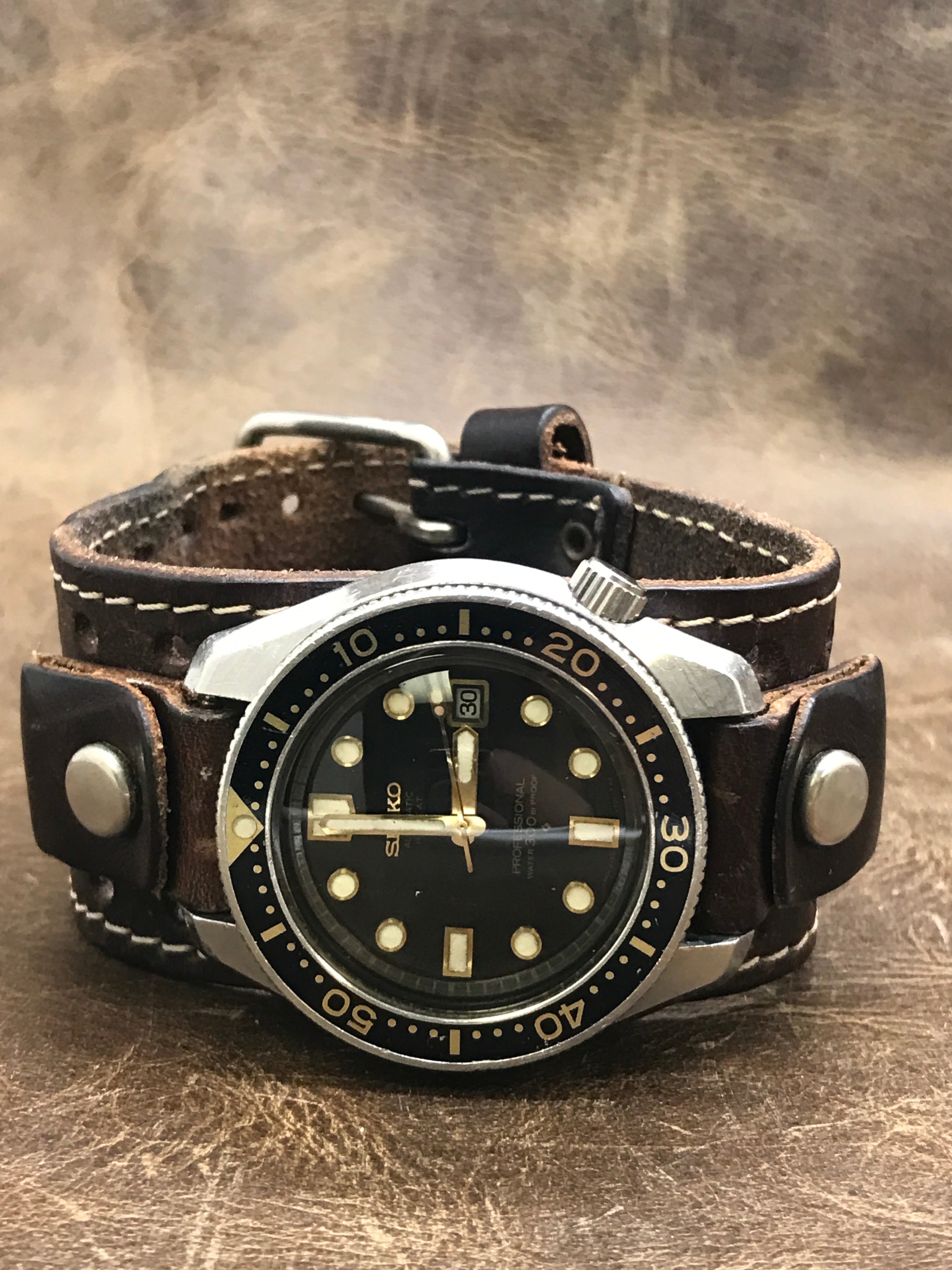 Stainless steel case with a leather custom strap. Uni-directional rotating stainless steel with a black aluminum ring bezel. Black dial with gold tone & luminous hands and luminous dots hour markers. Dial type: analog. Cal. 6159 automatic movement with about 46 hours of power reserve. Acrylic crystal. Screw down crown. Solid case back. Case size: 44 mm. Case thickness: 14 mm. Round case shape. Band width: mm. Custom tang clasp. Water resistant at 300 meters / 1000 feet. Functions: hours, minutes, seconds, date. Seiko Professional Diver Hi-Beat 6159-7001 Black Dial Automatic Men's Watch.