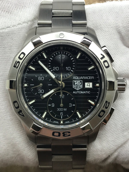 Stainless steel case with a stainless steel bracelet. Uni-directional rotating time lapse stainless steel bezel. Black dial with luminous silver-tone hands and index hour markers. Dial type: analog. TAG Heuer caliber 16 automatic movement with about 42 of power reserve. Scratch resistant sapphire crystal with anti-reflective treatment crystal. Screw down crown. Solid case back. Case size: 42 mm. Case thickness: 15 mm. Round case shape. Band width: mm. Fold over with push button release clasp. Water resistant at 300 meters / 1000 feet. Functions: date, hour, minute, seconds, chronograph. TAG Heuer Aquaracer CAP2110 Black Dial Automatic Men's Watch.