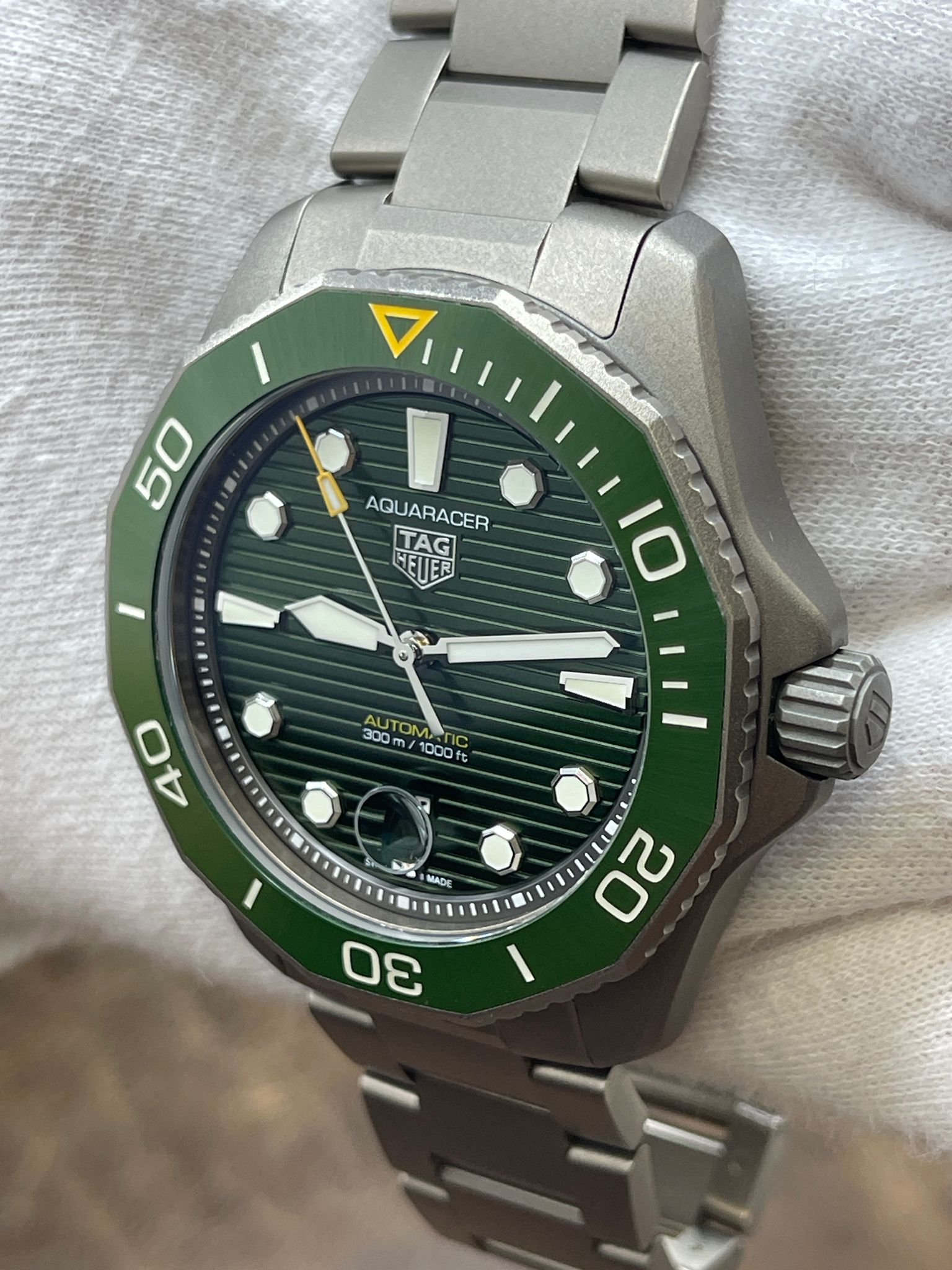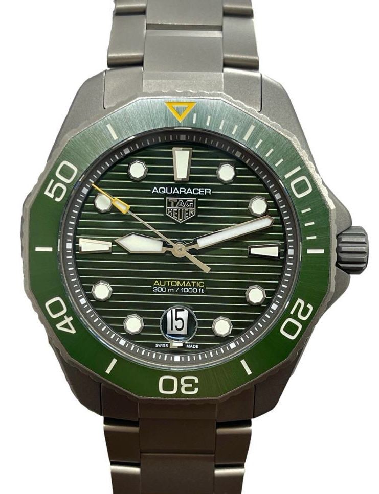 Titanium case with a titanium bracelet. Uni-directional rotating titanium with an inlaid green ceramic ring bezel. Green dial with luminous silver-tone hands and luminous dot & index hour markers. Dial type: analog. TAG Heuer calibre 5 automatic movement with about 38 of power reserve. Scratch resistant sapphire crystal. Screw down crown. Solid case back. Case size: 43 mm. Case thickness: 11.15 mm. Dodecagon case shape. Band width: mm. Fold over with push button release clasp. Water resistant at 300 meters / 1000 feet. Functions: date, hour, minute, seconds. TAG Heuer Aquaracer WBP208B Green Dial Automatic Men's Watch.