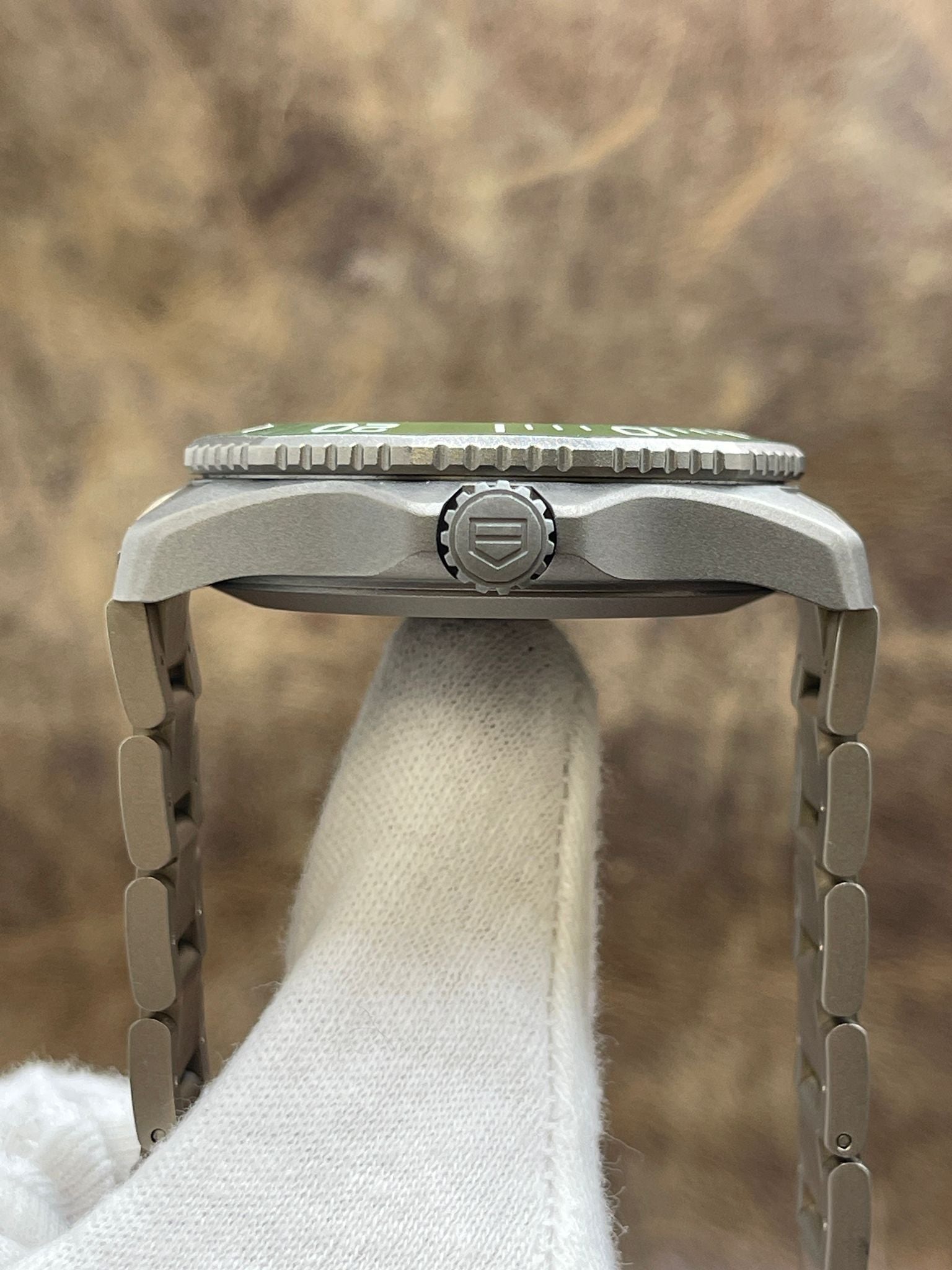 - Bezel Material Titanium with an inlaid Green Ceramic Ring