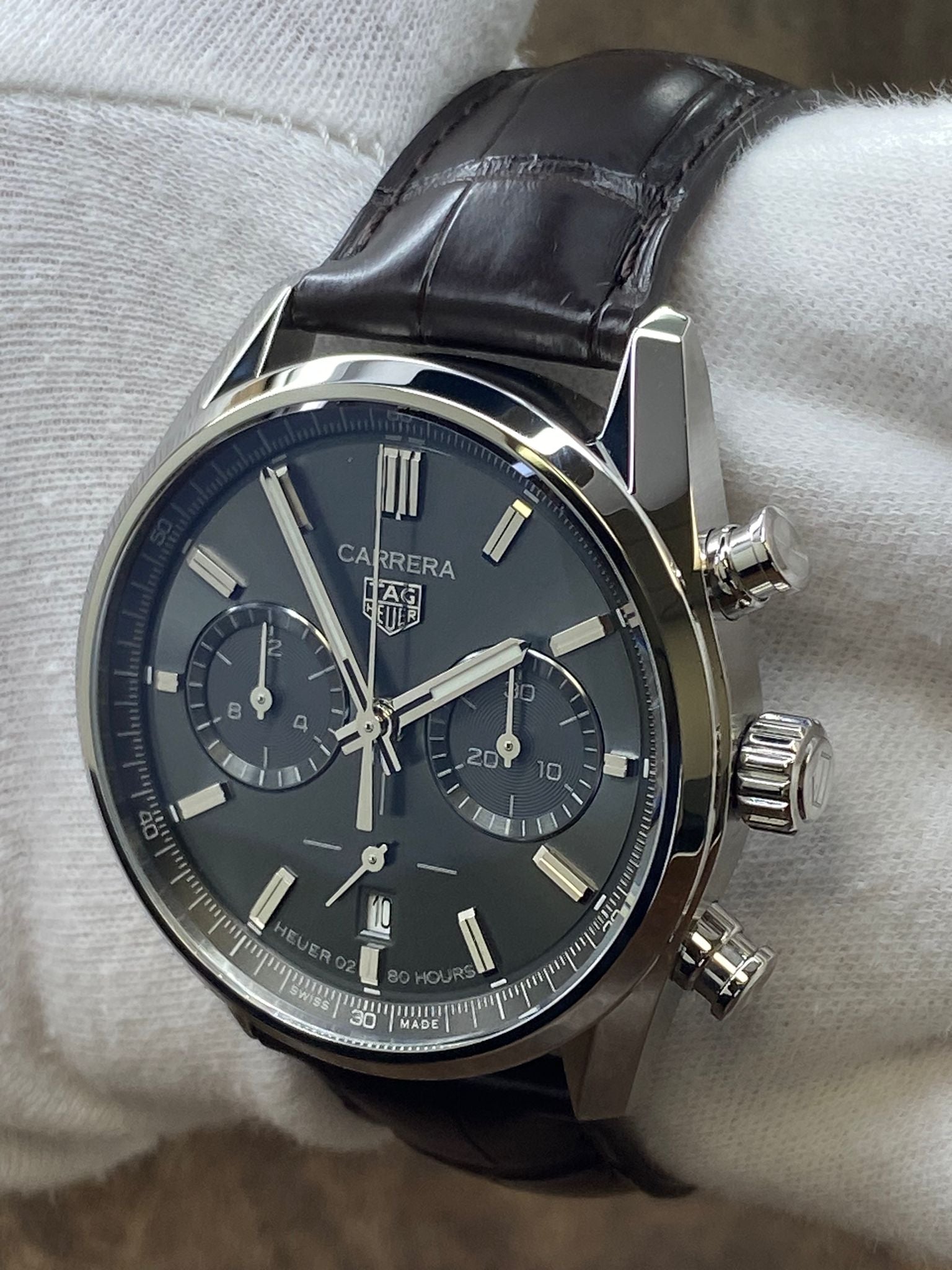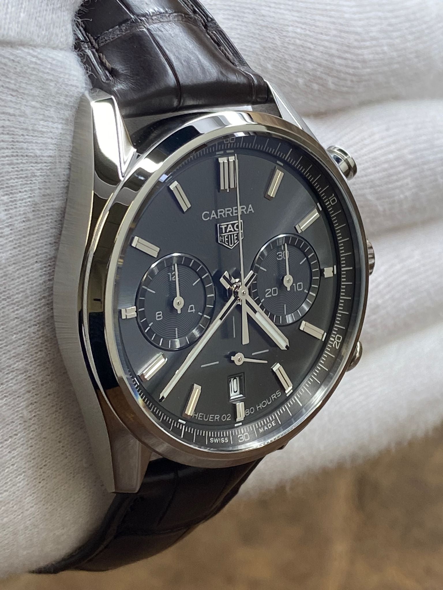 Stainless steel case with a leather strap. Smooth stainless steel bezel. Grey dial with luminous silver-tone hands and index hour markers. Dial type: analog. Caliber heuer 02 automatic movement with about 80 of power reserve. Scratch resistant sapphire crystal. Pull/push crown. Transparent case back. Case size: 42 mm. Case thickness: 14.8 mm. Round case shape. Band width: mm. Fold over with push button release clasp. Water resistant at 100 meters / 330 feet. Functions: chronograph, date, hour, minute, seconds. TAG Heuer Carrera Chronograph 42mm Heuer 02 CBN2012 Grey Dial Automatic Men's Watch.