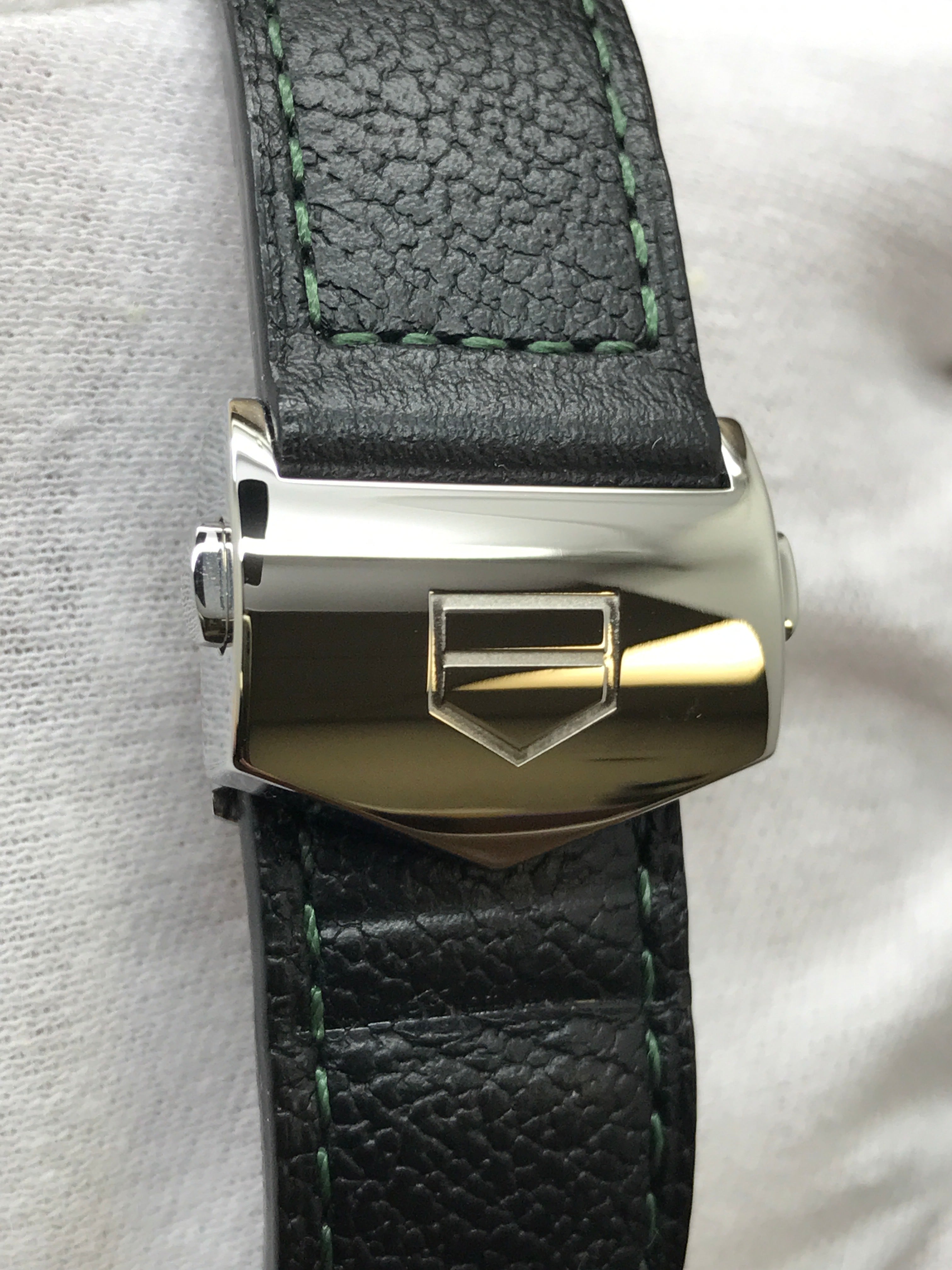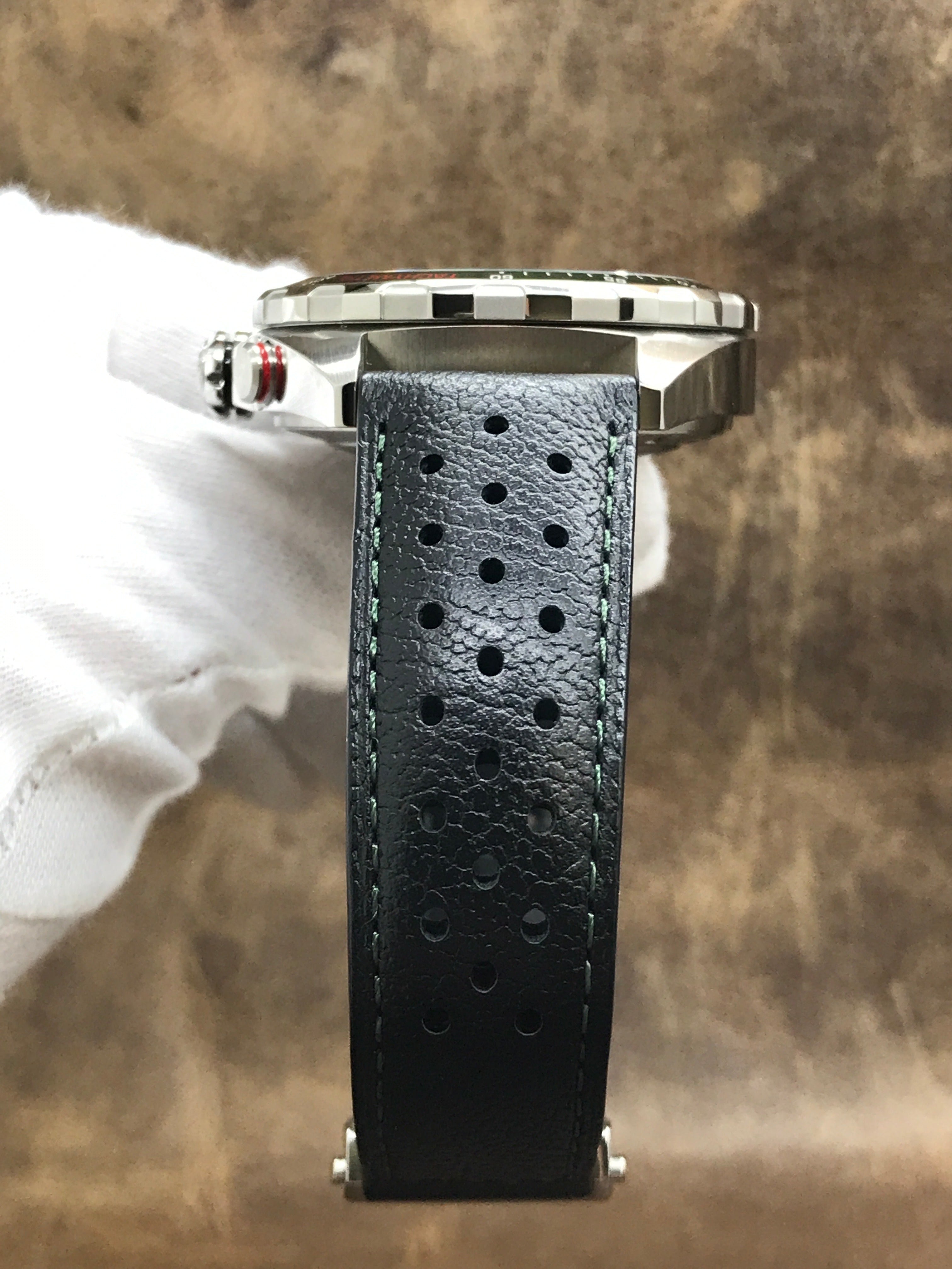 Stainless steel case with a calfskin leather strap. Fixed tachymeter scale stainless steel with green aluminum insert bezel. Green dial with luminous silver-tone hands and index hour markers. Dial type: analog. TAG Heuer calibre 16 automatic movement with about 42 of power reserve. Scratch resistant sapphire crystal. Crown. Solid case back. Case size: 44 mm. Case thickness: 15 mm. Round case shape. Band width: mm. Fold over with push button release clasp. Water resistant at 200 meters / 660 feet. Functions: date, hour, minute, seconds, chronograph. TAG Heuer Formula 1 Rare CAZ2016.FC6473 Green Dial Automatic Men's Watch.