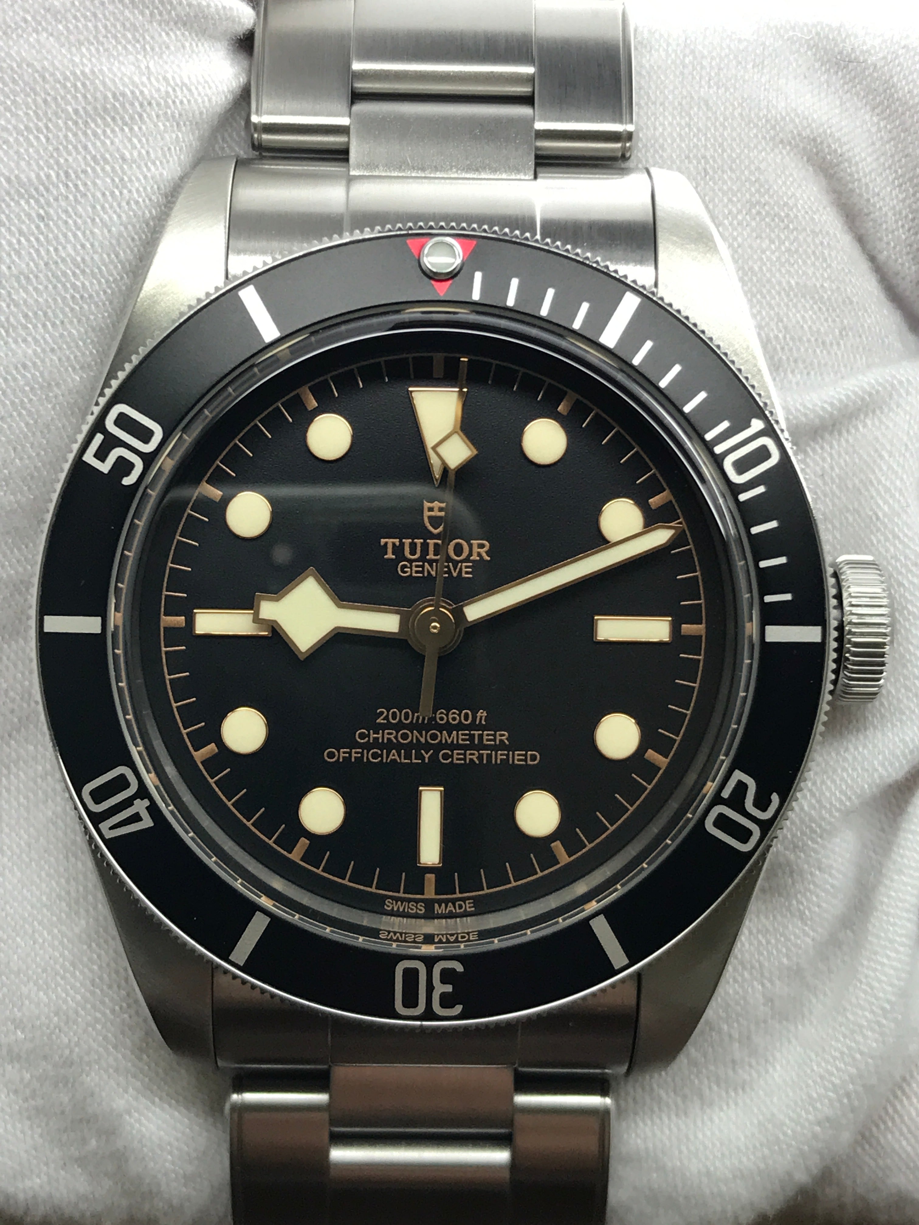 The Tudor Black Bay, introduced in 2012, gets its inspirations from the Submariners of Tudor's past. Due to the Tudor Submariners appealing design and demand by watch collectors and enthusiasts (mainly for its screw-down big crown), the company established this heritage collection with great popularity. While certainly vintage, the Black Bay has new features and modern design that the older models did not.