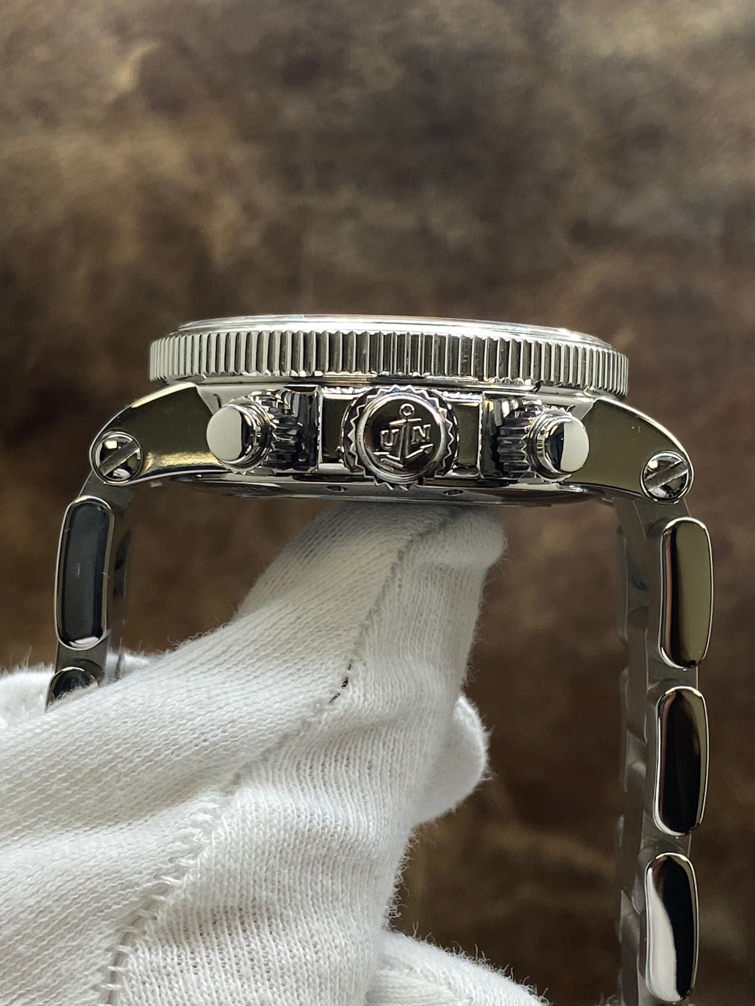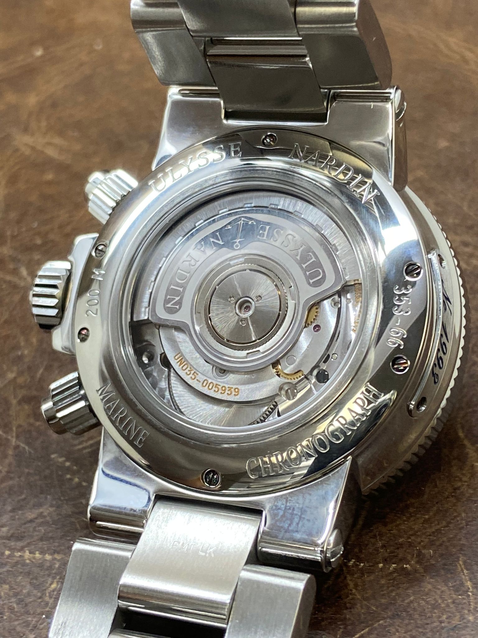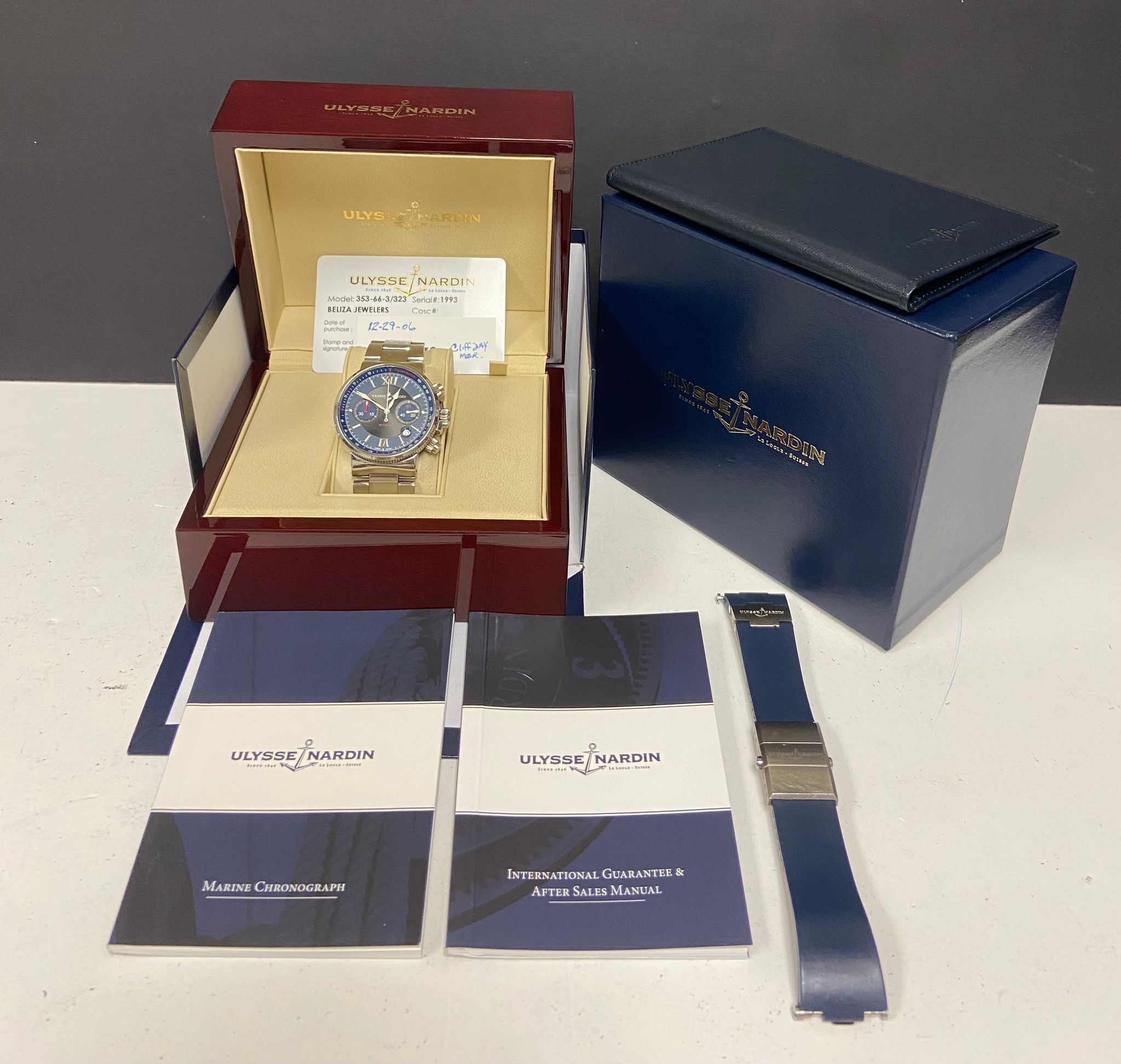 This pre-owned Ulysse Nardin Maxi Marine Chronograph 41mm B&P 353-66-3 is in mint condition and comes with: original Ulysse Nardin double box, booklets, extra rubber strap with buckle & matching warranty card dated 2006. Max wrist size: 7 in.
