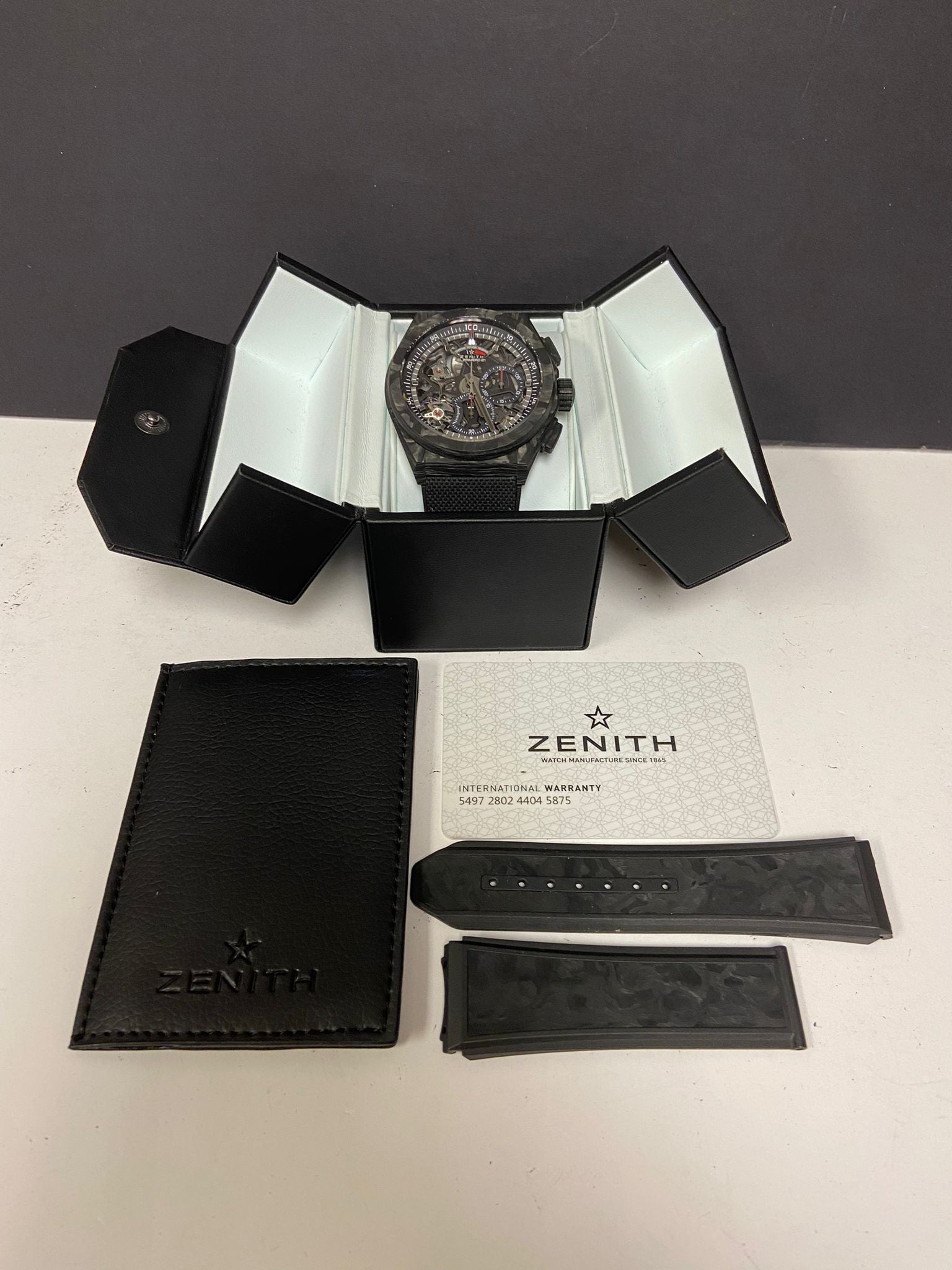 This pre-owned Zenith Defy El Primero 21 Carbon 44mm 10.9000.9004 is in excellent condition and comes with: original Zenith travel box, booklet, extra strap and matching warranty card. Max wrist size: 7.75 in.