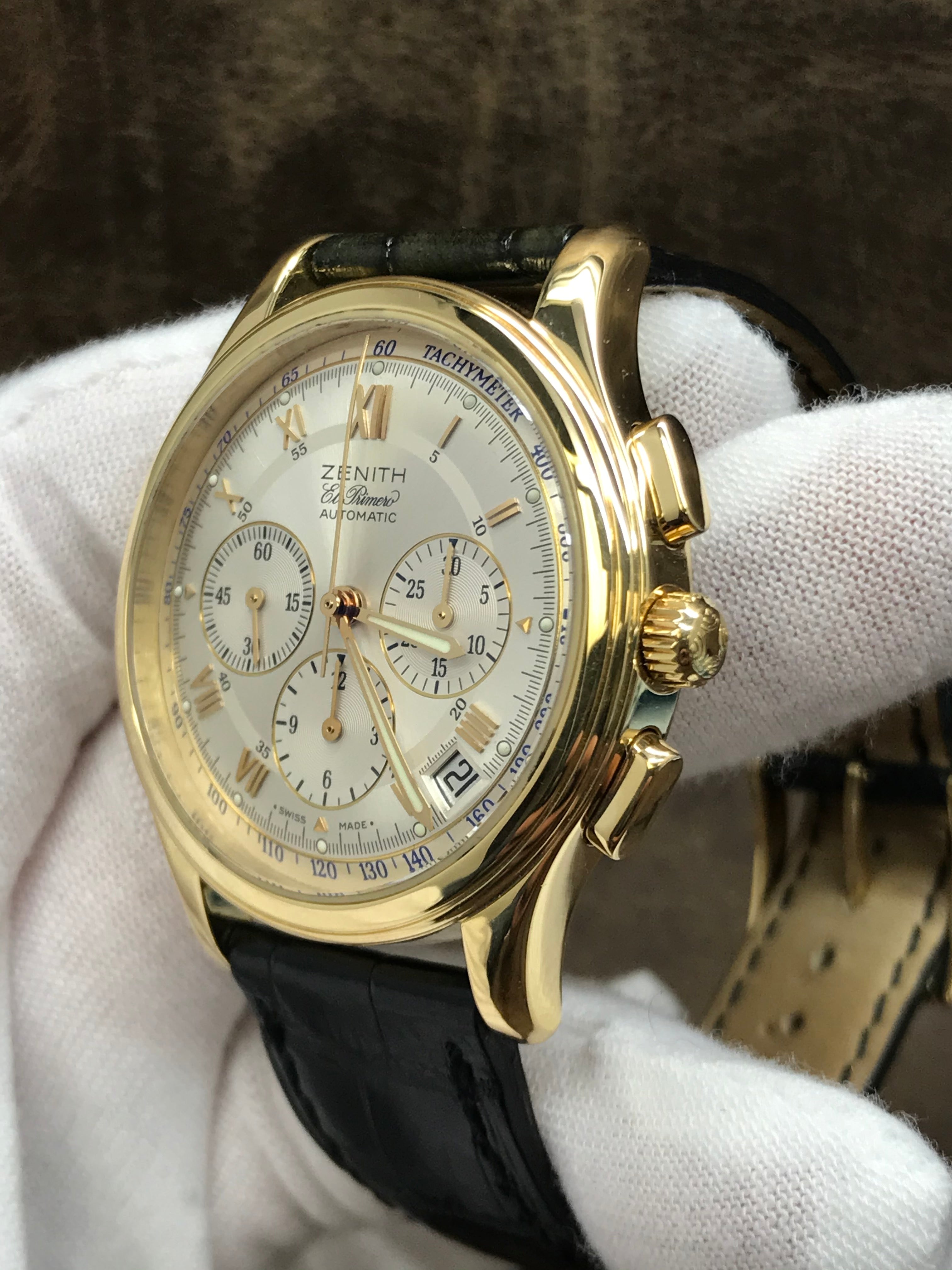 18k yellow gold case with a leather strap. Fixed 18k yellow gold bezel. Silver dial with gold tone & luminous hands and Roman hour markers. Dial type: silver. El primero 400 automatic movement with about 50 of power reserve. Mineral glass crystal. Pull-out crown. Display case back. Case size: 40 mm. Case thickness: 12.3 mm. Round case shape. Band width: 19 mm. Buckle clasp. Water resistant at 30m. Functions: chronograph. Zenith El Primero 30.0500.400 Silver Dial Automatic Men's Watch.