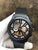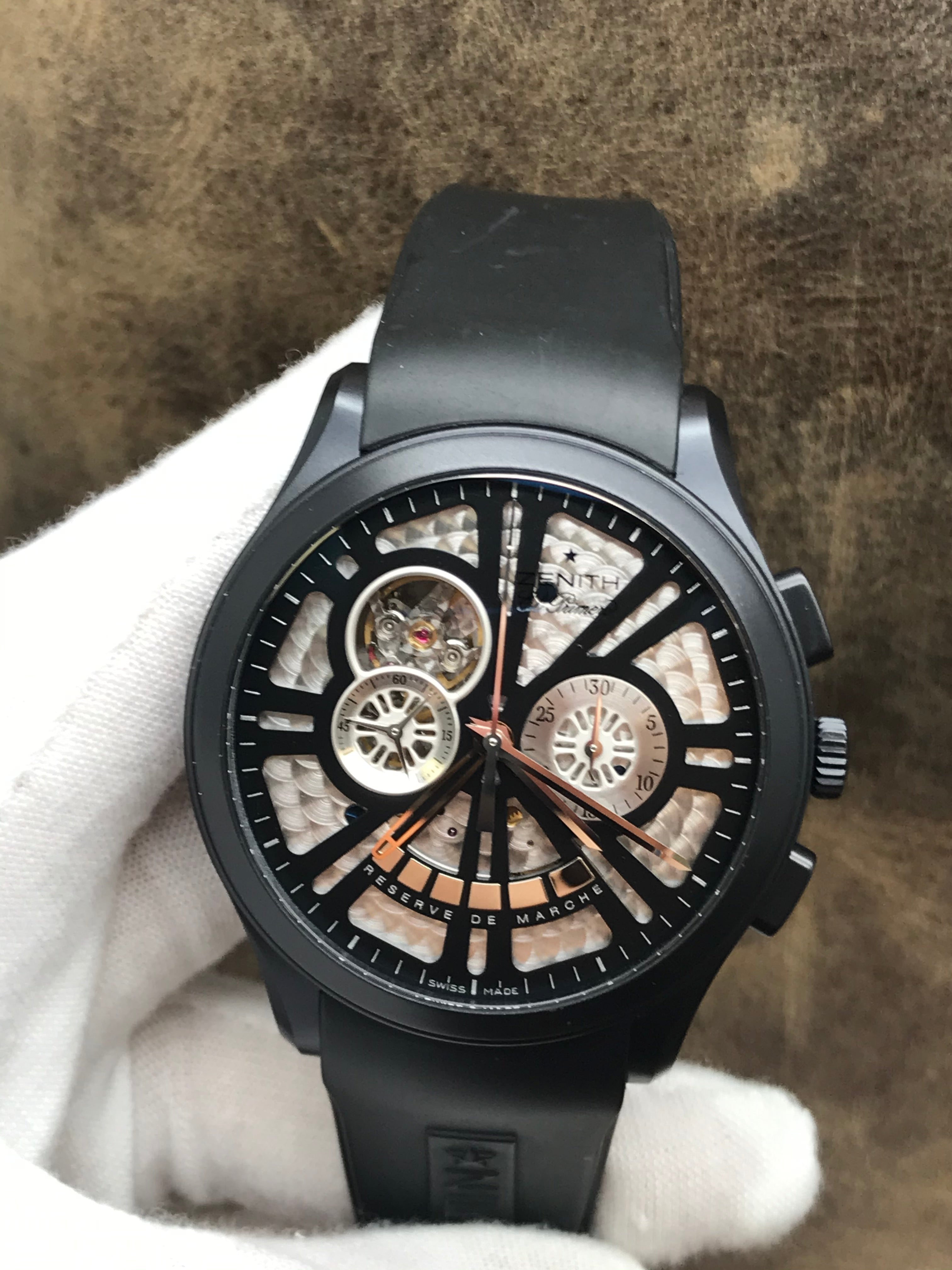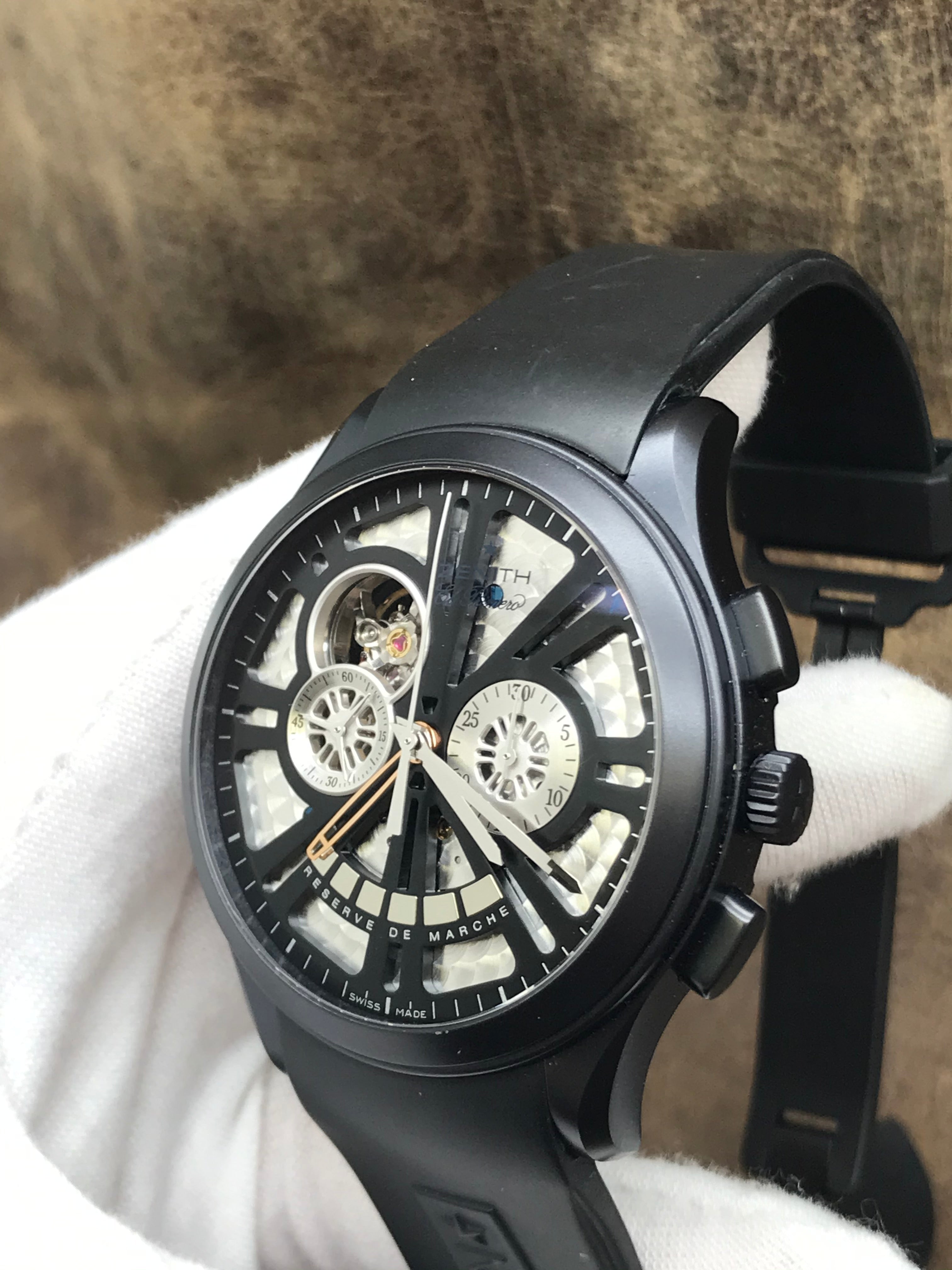 Black titanium case with a rubber strap. Fixed titanium bezel. Skeleton dial with silver tone hands and index hour markers. Dial type: analog. Luminescent hands and markers. Zenith calibre harmonic open el primero 4021 j3 automatic movement with about 50 hours of power reserve. Sapphire crystal. Pull/push crown. Transparent sapphire case back. Case size: 44 mm. Case thickness: mm. Round case shape. Band width: mm. Deployment clasp. Water resistant at 50 meters / 165 feet. Functions: chronograph, hour, minute, second, power reserve indicator. Zenith Grande Class 96.0520.4021 Skeleton Dial Automatic Men's Watch.
